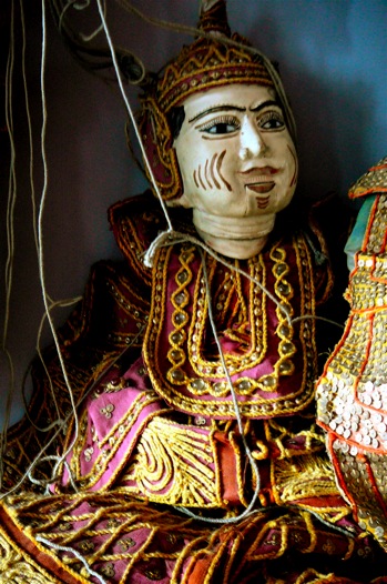 Burmese puppets are large wooden carved marionette, with glass eyes and real hair.